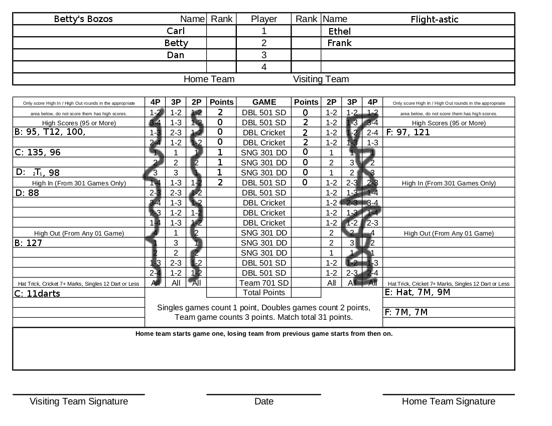 Below is a partially filled-out sample scoresheet in which a 3-player team is playing a 2-player team.